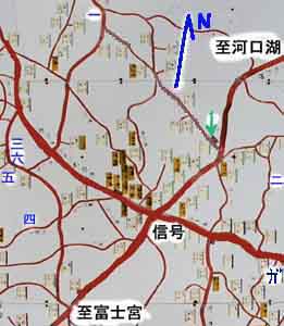 上九一色村の農道案内地図が村内各所にありましたのでここに掲げます(ほぼ上が北)。村内の現物の地図は北が左に描かれていますので要注意(右側の小さな写真が元の地図)。